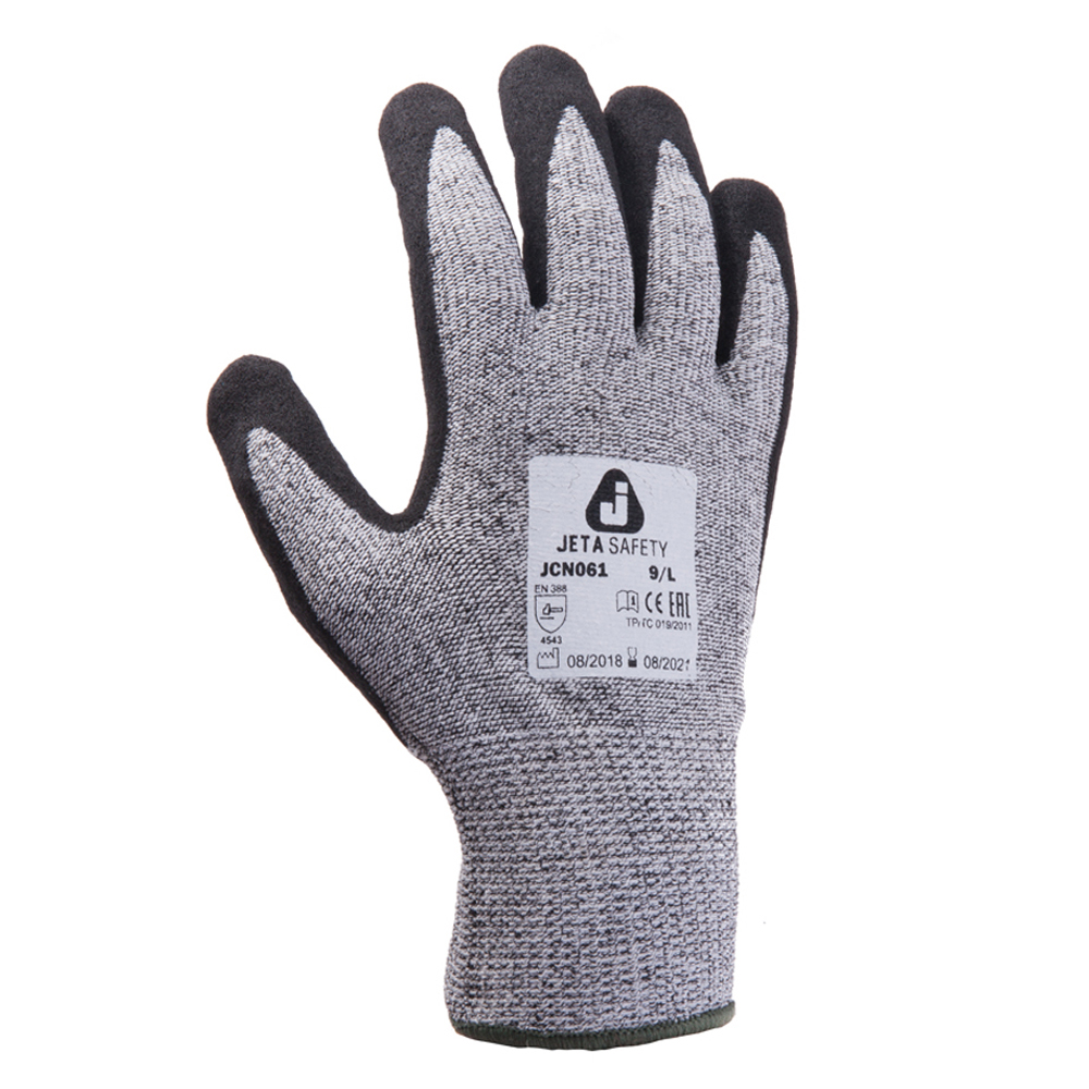 JETA SAFETY JCN061 – защитные промышленные перчатки от порезов для работ со стеклом, абразивами, колющими и режущими материалами. Изготовлены из материала HDPE, который обеспечивает максимальную стойкость к порезам (5 класс). Рельефное покрытие из нитрила позволяет работать со скользкими, мокрыми и замасленными предметами.