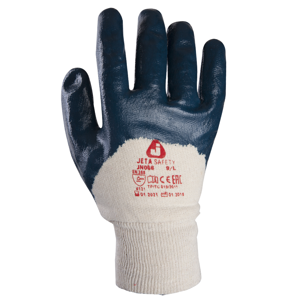JETA SAFETY JN066 – защитные перчатки с плотным маслобензостойким нитриловым покрытием на 3/4 поверхности для грубой и тяжелой работы. Джерсовая подкладка выполнена из 100% хлопка. Вязаная манжета надежно удерживает перчатку на запястье. Максимально высокий уровень износоустойчивости. Защита от проколов/порезов, воды, нефтепродуктов.