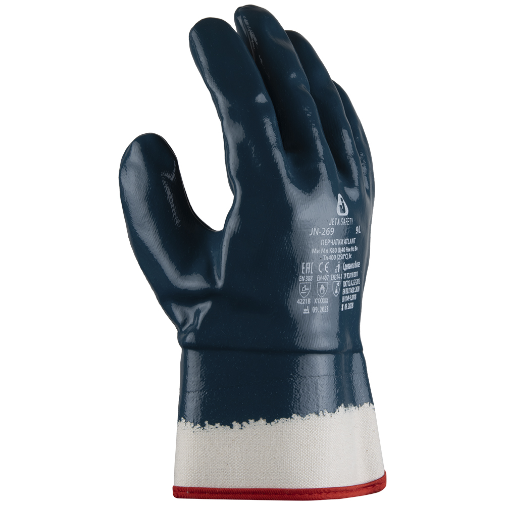 JETA SAFETY JN-269 Atlant – защитные перчатки с полным маслобензостойким нитриловым покрытием. Модель отличается высоким сопротивлением изнашиванию и надежными защитными свойствами. В JN-269 Atlant профессионал найдет для себя удобные и практичные перчатки, которые идеально подойдут для работ, связанных с повышенным количеством загрязнений, влаги и воды, жиров и масел, а также для операций со смазками и нефтепродуктами, кислотами и щелочами. Широко применяются в машиностроении, строительстве, монтажных работах, при работе с листовым металлом. Подходят также для укладки черепицы, бетонных работ, горного дела и нефтедобычи.